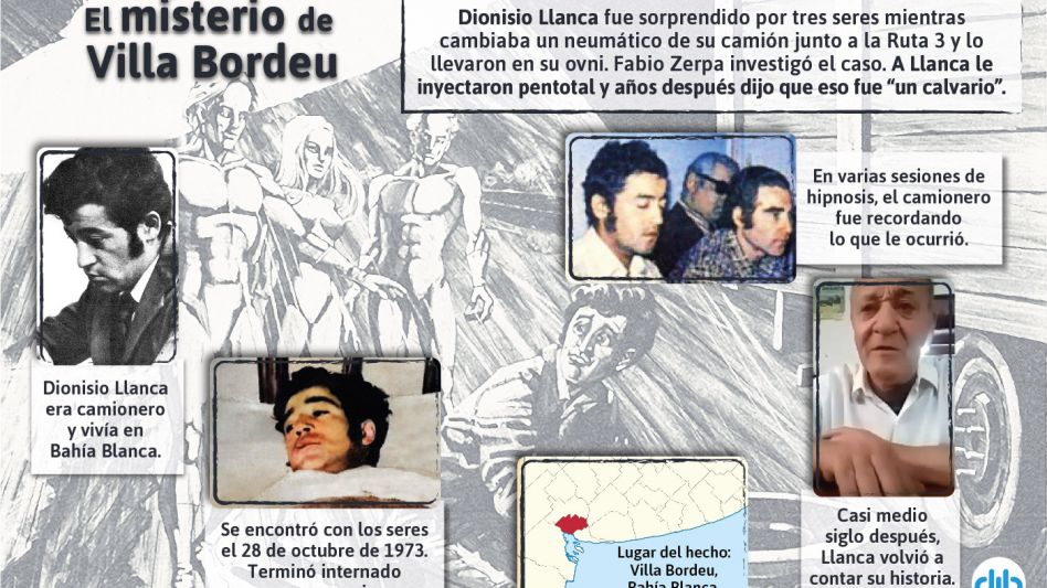 Dionisio Llanca tenía 25 años cuando, en la madrugada del 28 de octubre de 1973, salió de Bahía Blanca rumbo a Río Gallegos en un Dodge 600 cargado con materiales. En plena ruta, a la altura de Villa Bordeu o sus inmediaciones, el vehículo empezó a fallar por una cubierta baja y tuvo que detenerse para cambiar la rueda. Fue en ese momento, según su relato, cuando apareció una luz amarillenta que primero confundió con otro vehículo y después identificó como una nave suspendida a poca altura.
